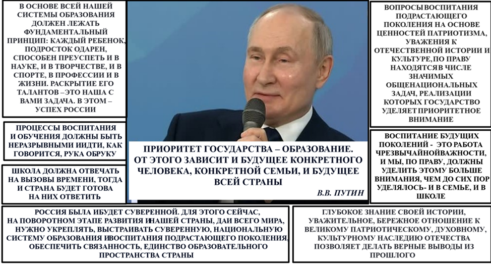 Постоянное внимание Президента России к обучению и воспитанию подрастающего поколения, применению современных технологий, строительству новых образовательных центров, поддержке талантливой молодежи свидетельствует о том, что образование признается стратегическим приоритетом, поскольку оно определяет будущее нашей страны и открывает дверь в завтрашний мир. Формирование суверенной системы образования и научно-технологический прорыв, о чем говорит В.В. Путин (рис. 2), невозможны без воспитания гармонично развитой, патриотичной и социально ответственной личности [9]. Именно это неизменно вызывает повышенный интерес общества к проводимым изменениям в образовании.