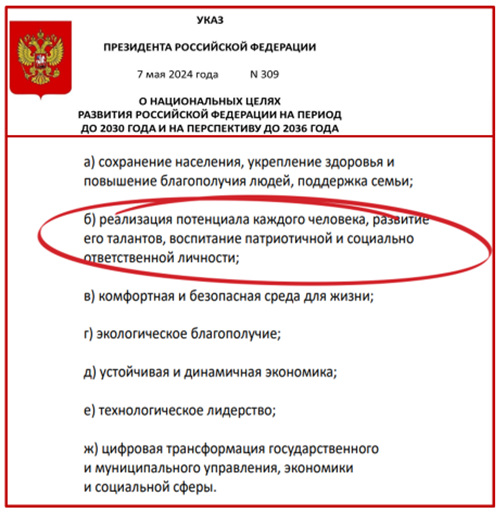 Приоритеты государственной политики в сфере образования отражены в Указе Президента РФ от 7 мая 2024 года № 309 «О национальных целях развития Российской Федерации на период до 2030 года и на перспективу до 2036 года» [11]. Согласно названному документу, одной из национальных целей является «реализация потенциала каждого человека, развитие его талантов, воспитание патриотичной и социально ответственной личности» (рис. 3), что имеет прямое отношение к развитию образования в нашей стране. На достижение этой цели направлен, в частности, национальный проект «Молодежь и дети»[2].