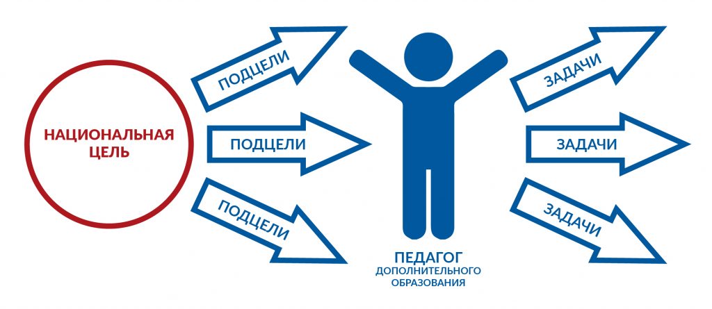 То есть можно сказать, что национальная цель делится на равнозначные и самоценные подцели, которые, в свою очередь, могут делиться на более мелкие и конкретные задачи, формируя детальную картину действий педагога дополнительного образования (рис. 4).