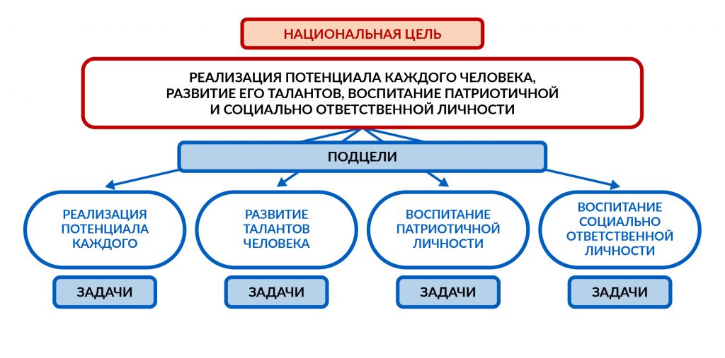 Прежде всего обратим внимание на многослойность национальной цели (реализация потенциала каждого человека, развитие его талантов, воспитание патриотичной и социально ответственной личности), а затем декомпозируем ее на несколько подцелей: