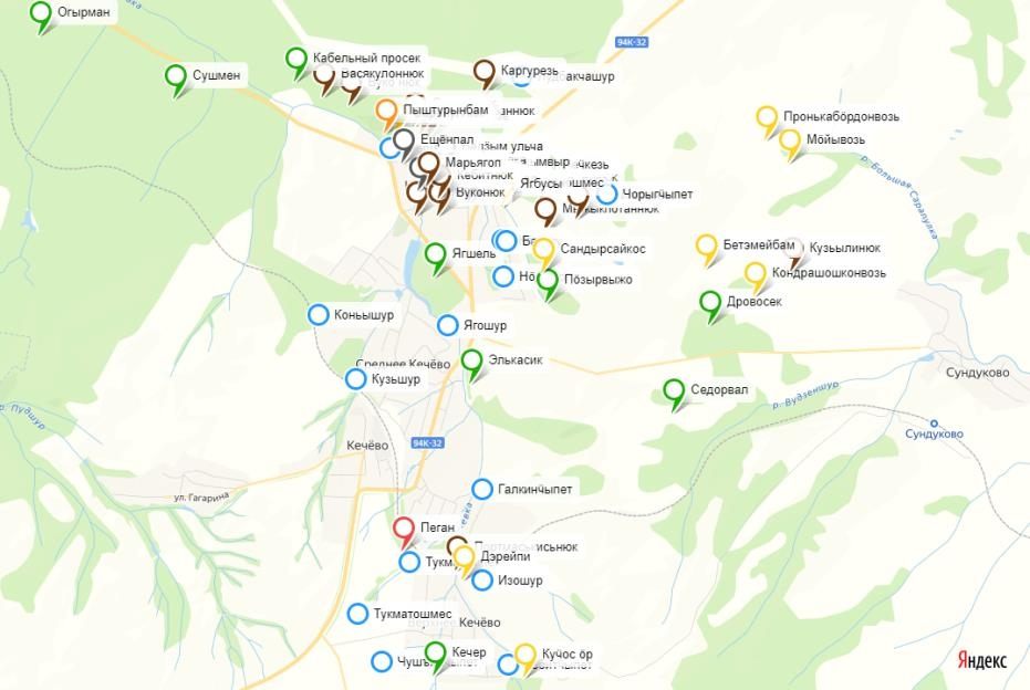 - микродримонимы – неофициальные названия рощ, боров, лесов (например, Позырвыжо, Пеӵкезь, Кабельный просег, Сушмен, Огырман, Ягшель, Кечер, Седорвал, Дровасек, Элькасик);