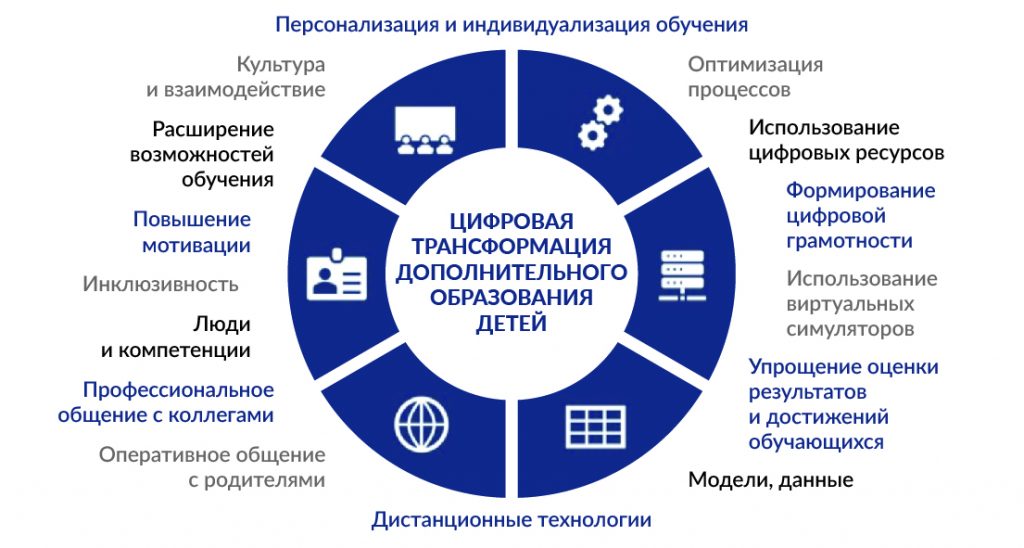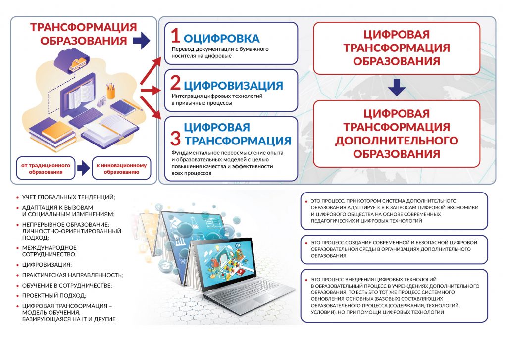 Обобщая приведенные определения, можно сформулировать следующее: цифровая трансформация дополнительного образования – это интеграция процессов создания современной и безопасной цифровой образовательной среды и внедрения цифровых технологий в образовательный процесс, что позволяет обновлять содержание образования, методы и организационные формы обучения и воспитания, а также планировать и оценивать образовательные результаты.