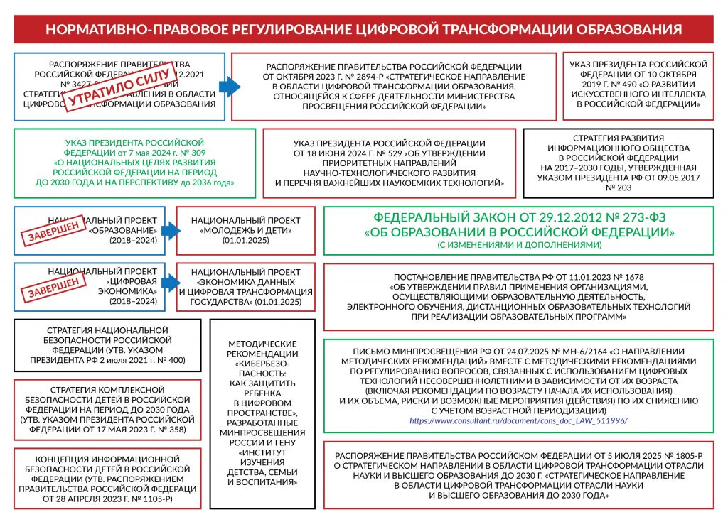В нашей стране создается нормативно-правовая база цифровой трансформации образования (рис.3), включающая документы разного характера и уровня – от указов Президента Российской Федерации, Национальных и федеральных проектов и документов стратегического планирования до методических рекомендаций по реализации конкретных шагов в образовательных организациях.