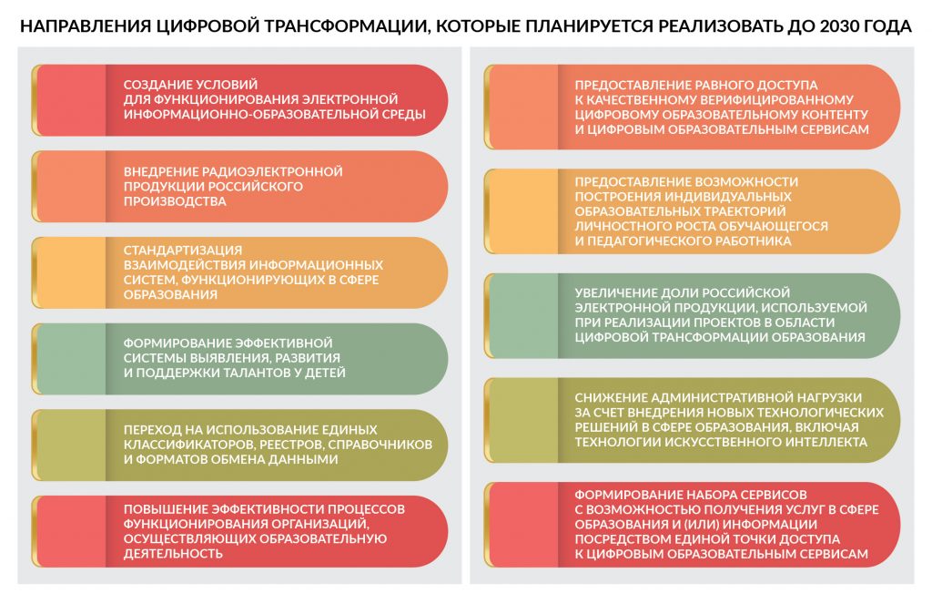 В рамках «Стратегического направления цифровой трансформации образования», действующего до 2030 года, планируется реализовать следующие направления [14]. Для удобства восприятия они представлены на рисунке (рис. 4):