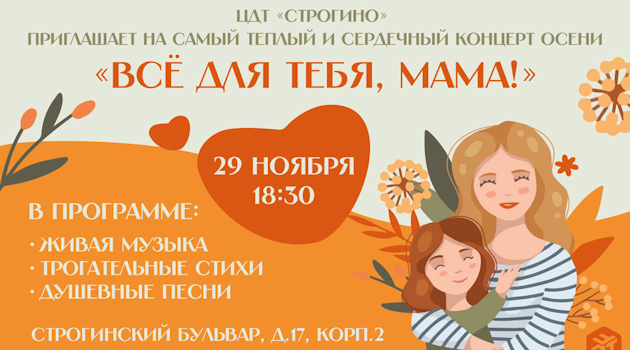 Дорогие друзья! “Центр детского творчества “Строгино” приглашает вас на особенный вечер — «Всё для тебя, мама!», посвящённый самому дорогому и трогательному празднику — Дню матери!
