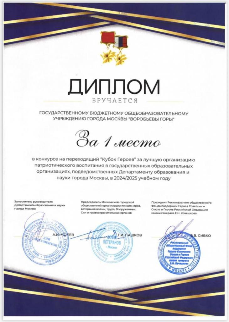 Поздравляем весь коллектив ГБОУ «Воробьевы горы», обучающихся и их родителей с получением высокой награды — «Кубка героев»!