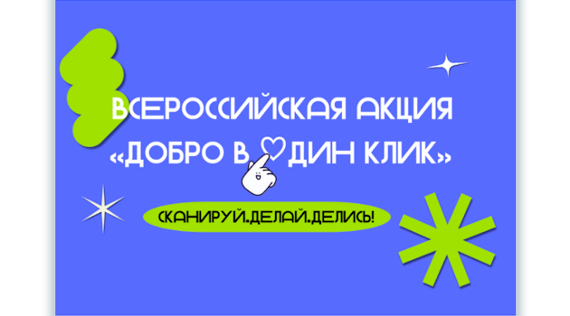 Всероссийская акция «Добро в один клик» — возможность для обучающихся образовательных организаций Российской Федерации прикоснуться к миру волонтёрства, развить свой гражданский потенциал и выразить себя через добрые дела. Мы стремимся воспитывать в молодёжи социальную ответственность, милосердие и готовность менять мир к лучшему.