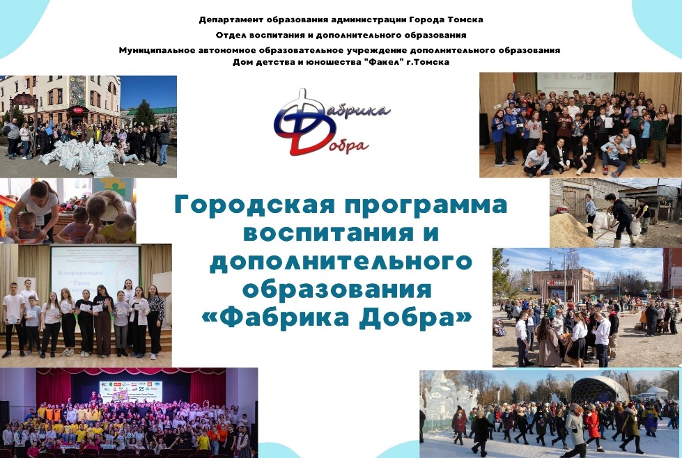 Однако, несмотря на все проблемы, волонтерство продолжает активно развиваться и расширять сферы своей деятельности, создавая новые отрасли безвозмездной помощи. Одним из таких примеров является реализация на протяжении семи лет в городе Томске Городской программы воспитания и дополнительного образования «Фабрика Добра» (далее – Программа), одним из направлений которой является вовлечение школьников в благотворительную деятельность. За это время в Программе приняли участие 38 образовательных учреждений города Томска, более 4500 школьников, которые стали участниками более 7000 общественно полезных дел.