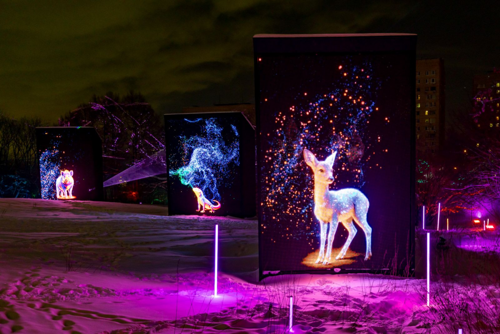 На фасаде Московского дворца пионеров каждый вечер можно было увидеть световое шоу. На территории парка расположили мультимедийные экраны с изображениями 125 животных со всей России, в том числе краснокнижных. В зоне Арктики масштабный экран с аудиовизуальными эффектами помогал погрузиться в атмосферу Заполярья и увидеть белых медведей, северное сияние и ледокол.