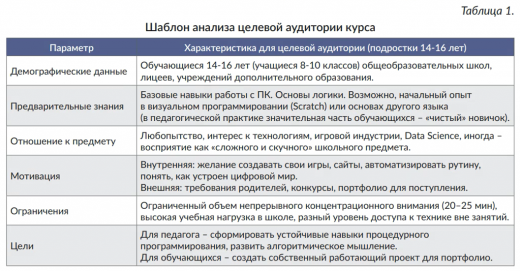 Анализ аудитории: подростковая аудитория (14-16 лет) характеризуется стремлением к самостоятельности, практико-ориентированным мышлением, высокой восприимчивостью к игровым и соревновательным элементам, а также потребностью в быстром получении видимого результата. При этом наблюдается значительный разброс в уровне начальной подготовки, скорости усвоения материала и типе мотивации (внешняя/внутренняя). Для систематизации данных целесообразно использовать «Шаблон анализа целевой аудитории» (Табл. 1).