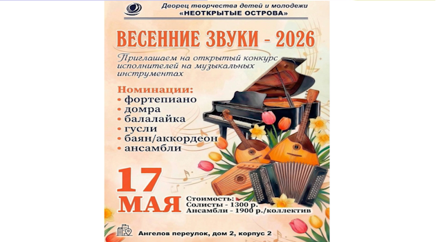 Если ты играешь на фортепиано, домре, балалайке, гуслях, баяне или аккордеоне, то скорее подавай заявку на участие в открытом конкурсе исполнителей на музыкальных инструментах «Весенние звуки»!